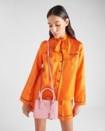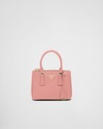 Production of the Prada Galleria bag, composed of 83 pieces, is an authentic fusion between industrial precision and the refined accuracy of craftsmanship that can only be performed by hand. The design is clean and elegant yet innately pragmatic, an aesthetic language blending form and function that combines history and modernity. Originating the definition of “timeless”, the Galleria bag has become a hallmark of Prada’s identity in the twenty-first century. The accessory, presented in the mini version, is made of iconic Saffiano leather that was patented by the founder of the brand and features a crosshatch texture and waxed finish.
