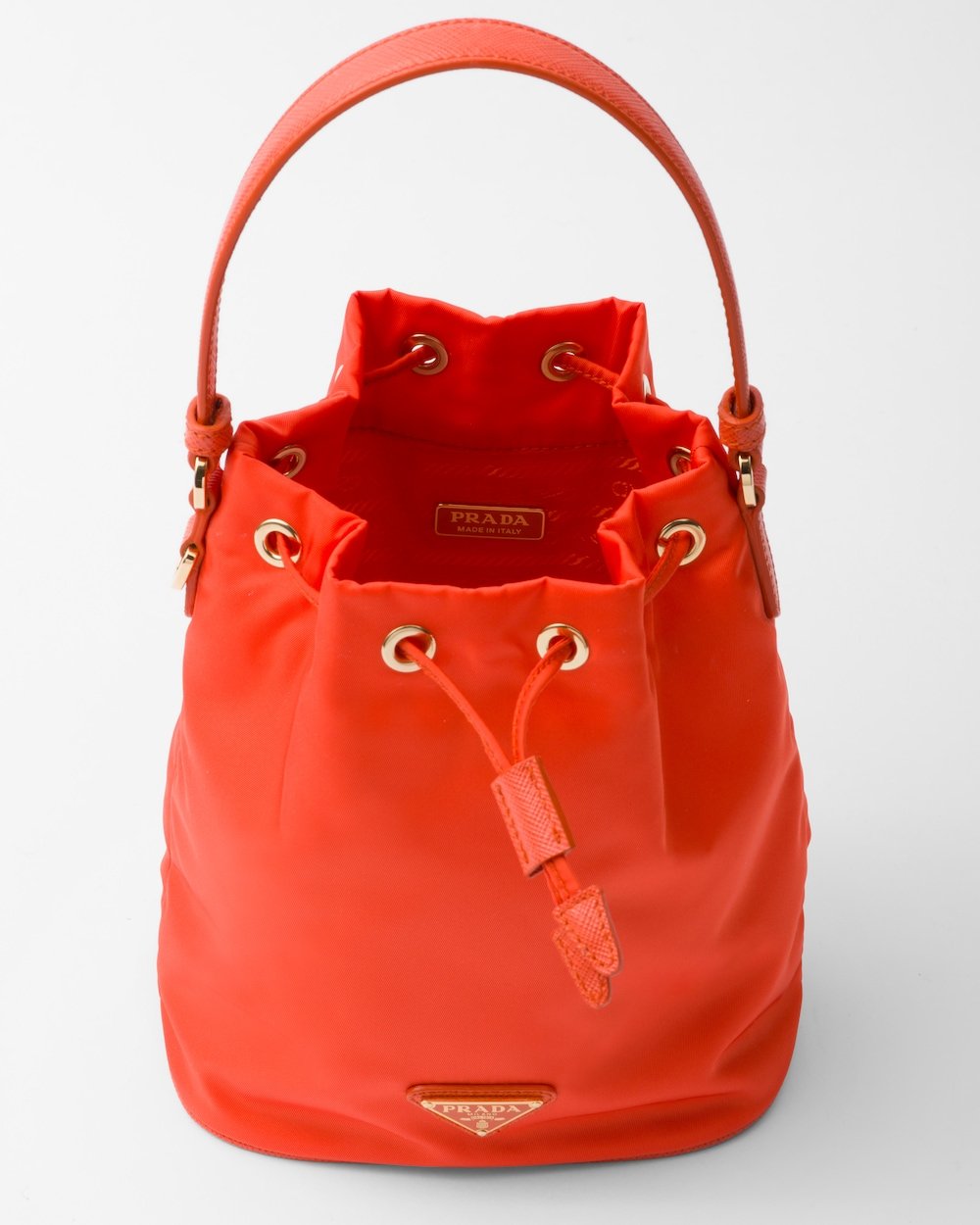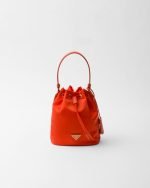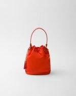 Functional and innovative Re-Nylon is the sustainable evolution of a distinctive material in Prada’s DNA, an expression of the brand’s original and unconventional aesthetic. This mini-bag made of regenerated nylon has an iconic bucket silhouette, a Re-Edition of an archive style, decorated with leather details and metal hardware. The exclusive and refined accessory, carried by a hand or worn with the removable shoulder strap, is embellished with the enameled metal triangle logo.