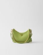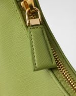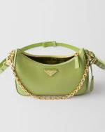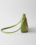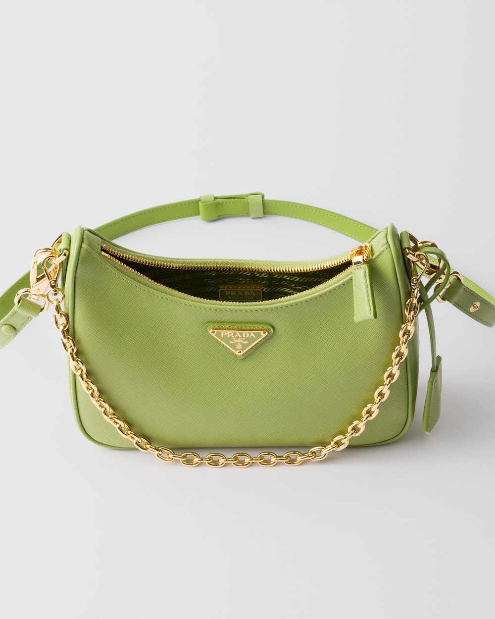 Sleek lines and iconic details define this versatile bag characterized by removable chain and leather handles. The accessory made of Saffiano leather is embellished with the distinctive enameled metal triangle logo.