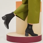 Ankle boot in knit with ‘Clic! C’est Noue’ motif, ‘Ex-Libris’ motif in calfskin and heel with horseshoe detail.