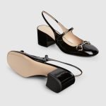 The iconic Horsebit defines this pair of patent leather pumps. The rounded toe and the adjustable ankle closure complete the style, enhancing its preppy spirit.